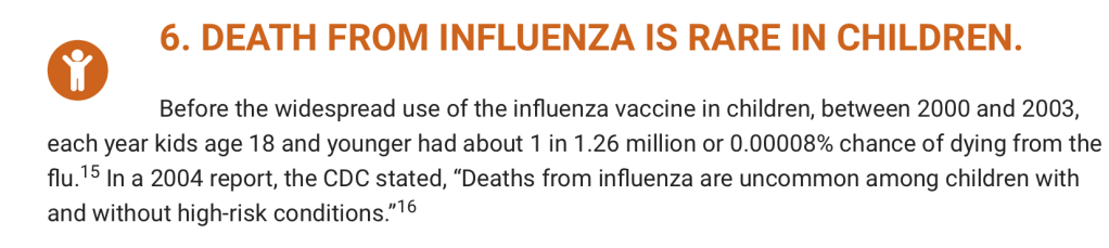They are referring to a concept called original antigenic sin here. As is typical, when there is controversial information in virology, the antivax ecosystem twists it to suit their message. The concept refers to the immune system recognizing a previous version of a virus via infection or vaccination, and then because it is “used” to that version, it has more difficulty recognizing the newest version of the virus. The PIC also fail to consider the carryover effect, which means that the benefits of the prior season influenza vaccine can carry over to the new season in some cases, and artificially elevate the effectiveness comparison. The CDC has specifically studied flu season vaccine effectiveness by season, and they have found that although the effectiveness changes from year to year, the effectiveness remains. Again I repeat the recurring theme – informed consent is created when the patient is given a full overview of all the facts in their appropriate context. Point number 5 above is taken out of context.