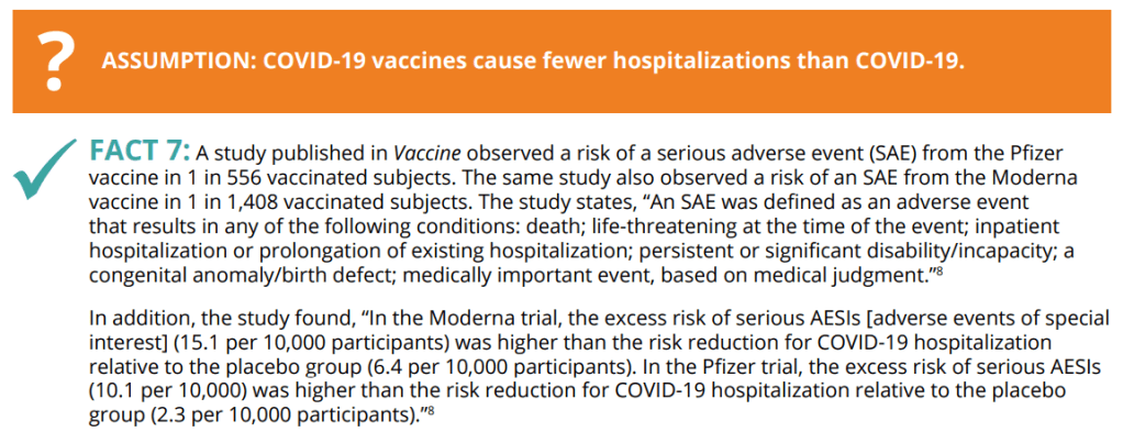 The study that was referenced to make this claim committed the dishonest statistical trick of p-hacking, which is in laymans terms, rearranging the data until you get the statistical result you prefer to hear. The actual answer to this question is that the number of hospitalizations depends on the age group queried, gender, specific side effected identified, and time the study was completed. Overall, every single population level study demonstrates COVID hospitalizations were less frequent in vaccinated populations. The first two side effects of special interest that gained massive public and media attention were clots and myocarditis. Clots are now known to be associated with the viral vector vaccine, and the Astra Zeneca/ Johnson+Johnson vaccines are essentially not available due to the research into this side effect. The mRNA vaccines are known to cause myocarditis in rare instances, mostly in teen boys and young men, although the exact cause of the myocarditis is unknown (current research is leaning towards a genetic mutation in how people handle immune system responses). Myocarditis specifically has different rates in different age groups, but public health agencies are no longer recommending two vaccines spaced two months apart in large part due to this concern. COVID vaccines clearly decrease all-cause cardiac events in all ages they were tested. So overall, Physicians for Informed Consent has misstated the research multiple times here and also neglected to describe what actual researchers have done to mitigate COVID vaccine side effects.