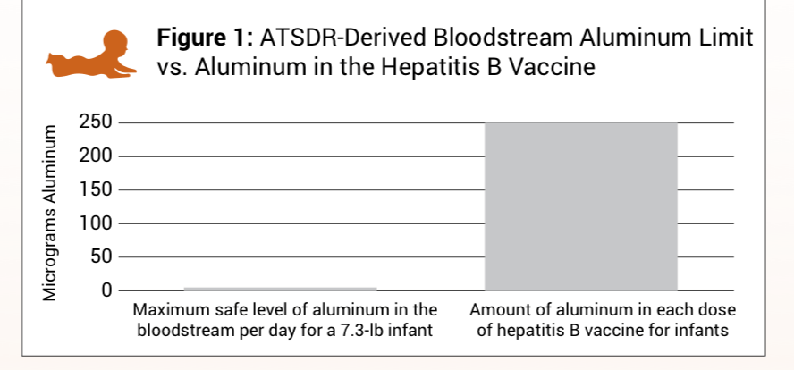 For children, the hepatitis B vaccine contains 250 mcg of aluminum. This amount is 75 times greater than the maximum safe level of aluminum in the bloodstream per day for a 7.3-pound (3.3-kilogram) infant, derived from the Agency for Toxic Substances and Disease Registry (ATSDR), a division of the U.S. Department of Health and Human Services (HHS) (Fig. 1).